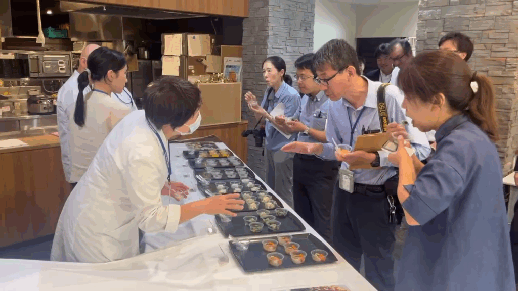 先日、嚥下食メニューの試食会が行われました。参加者の皆様から「食材本来の味がして美味しい」など好評の声をいただきました。また、バリアフリー旅館である湯の瀬の館内もご覧いただきました。