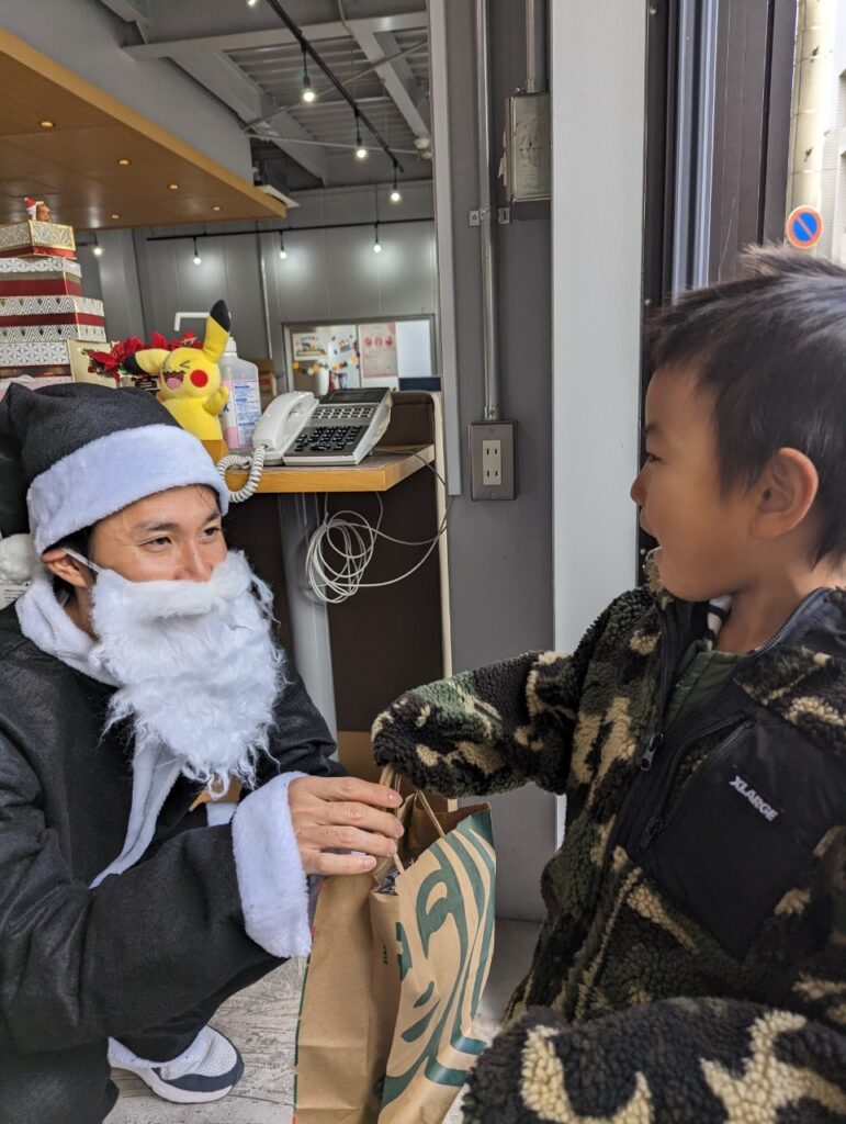 今回のメニューは「クリームシチュー」と「パン」「オレンジゼリー」でした。クリスマス「あなたもサンタクロース募金」にて集まった募金を利用して子供達へプレゼントをお渡し。ブラックサンタがこども達ひとりひとりに手渡し。