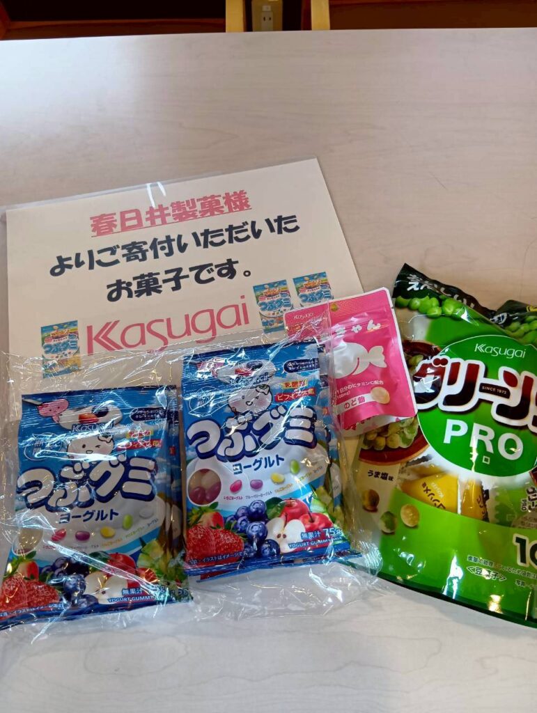 今回も春日井製菓さん、関係者の皆様からご寄付頂いたお菓子をこども達のお土産にさせて頂きました。皆様いつもご支援、ご協力本当にありがとうございます。