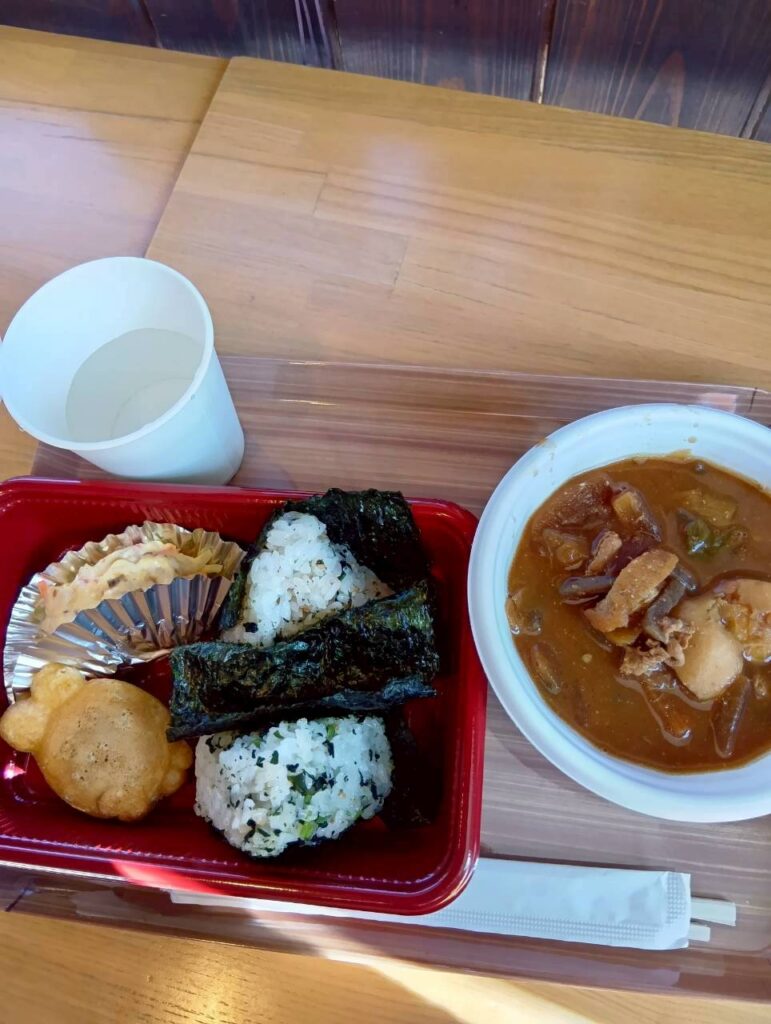 昼食は寒い季節なので、温かい豚汁とおにぎりでした。ご寄付頂いた品物で提供させて頂きました。